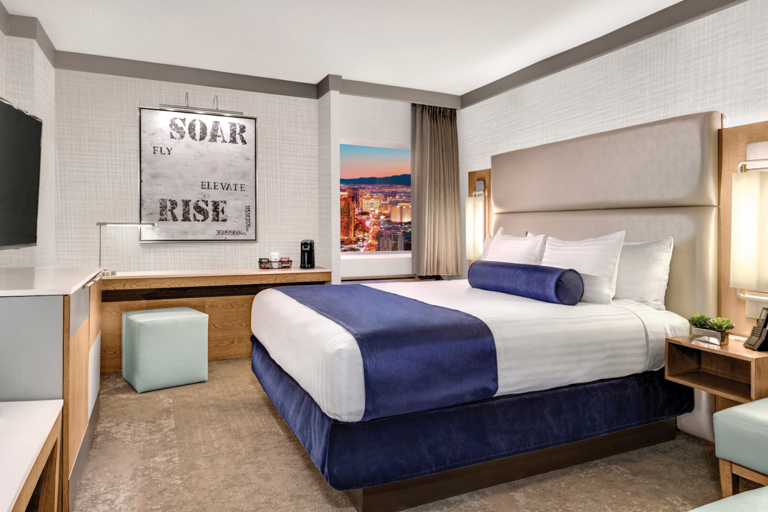 The Elevate King is 340 square feet and includes one king bed. Rooms feature a mini fridge, 55-inch HD TV, in-room safe and USB charging stations. For those who need to work while they play, the room includes a designated work area with desk. Fresh and modern, our Elevate King will take your stay to a new level.